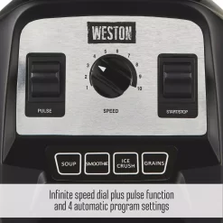 Weston believes in reconnecting with real food. We make products to help you do that. With our new professional series blender you can add more fruits, vegetables, nuts, and whole grains to your diet with breakfast smoothies, nut butter for sandwiches, afternoon green juice pick-me-ups, and creamy hot soups for dinner. . Our unique grain program provides freshly ground whole grains for breads, muffins and more. Our professional series blender combines powerful blending with versatility in the kitchen with pulse function, infinite speed dial for ultimate control, and four program settings for walk-away convenience. You can grind grain to make your own flour, process fresh veggies into hot soups in a matter of minutes or make healthy smoothies on the fly. The extra-large 64 ounce BPA-free container is shatterproof and holds enough for family-size servings of whole food deliciousness or just as easily blends a smoothie for one. An all-metal drive and stainless steel blade easily powers through frozen fruits, nuts, and ice. Built to provide years of blending, the blender is backed by an eight-year limited warranty. Blend your own special combination of ingredients or use the included recipe book with recipes for soups, breads, salads and smoothies. Each included recipe offers fresh ingredients, vibrant flavors, and easy blending steps. With Weston you can control exactly what ingredients are going into your food and body.