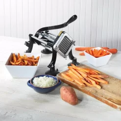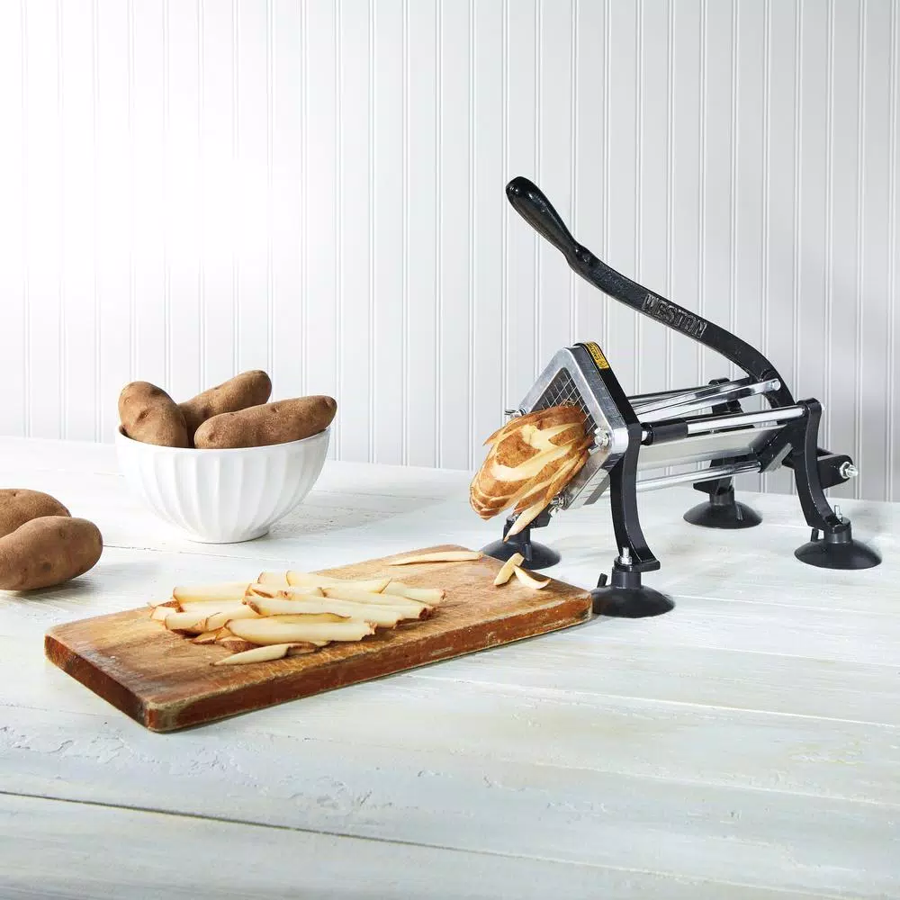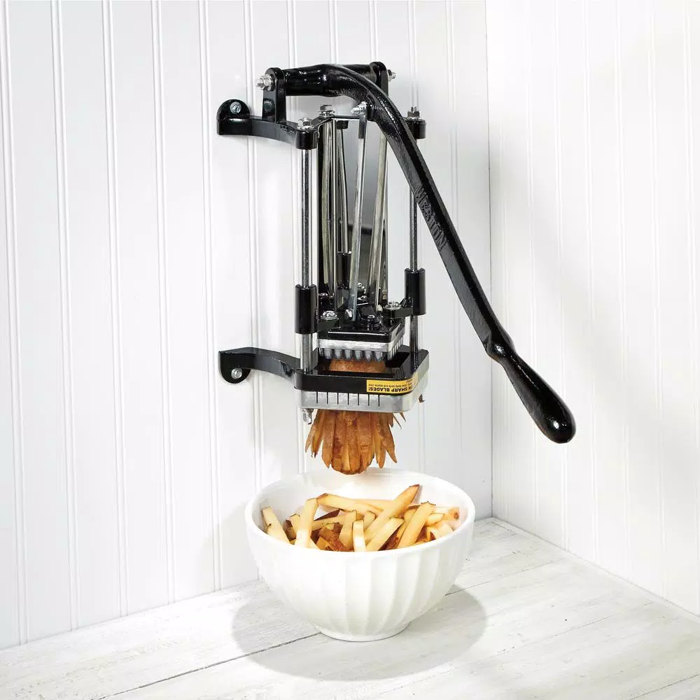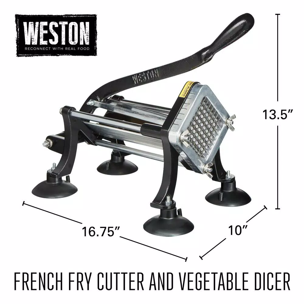 Make restaurant style French fries at home any night of the week. The Weston Professional French Fry Cutter and Vegetable Dicer makes it easy to quickly cut pounds of potatoes for loaded cheese fries, fish and chips, baked sweet potato fries, steak frites and more – all while having complete control over the quality of the ingredients. Just put potatoes in the press and push down on the handle; the pusher will advance the food through the blades. In one smooth motion, you will have a batch of perfectly cut fries ready to be cooked. It includes four suction cup feet for countertop use or it can be permanently mounted to the wall. The 3/8 in. stainless steel blade makes easy work of cutting through most root vegetables and the cast iron construction is designed for durability. You can even use it for dicing fruits and veggies.