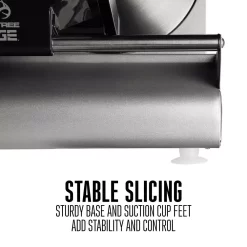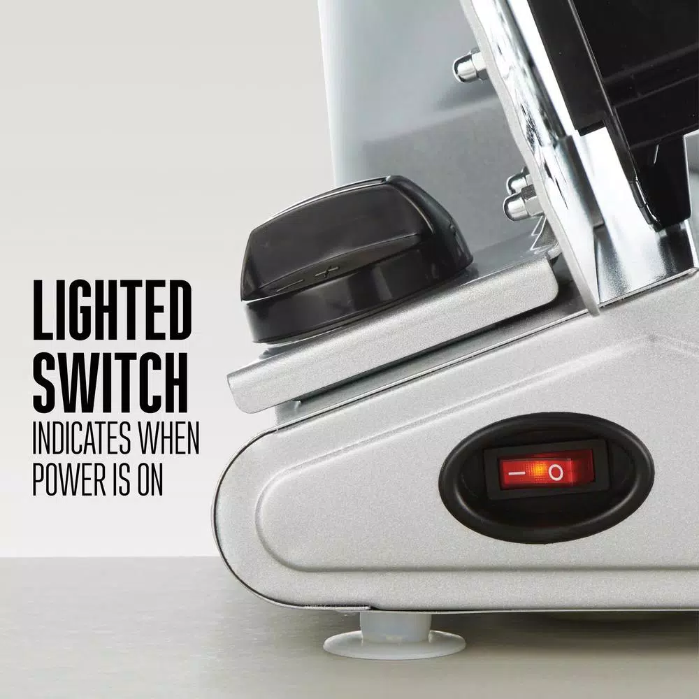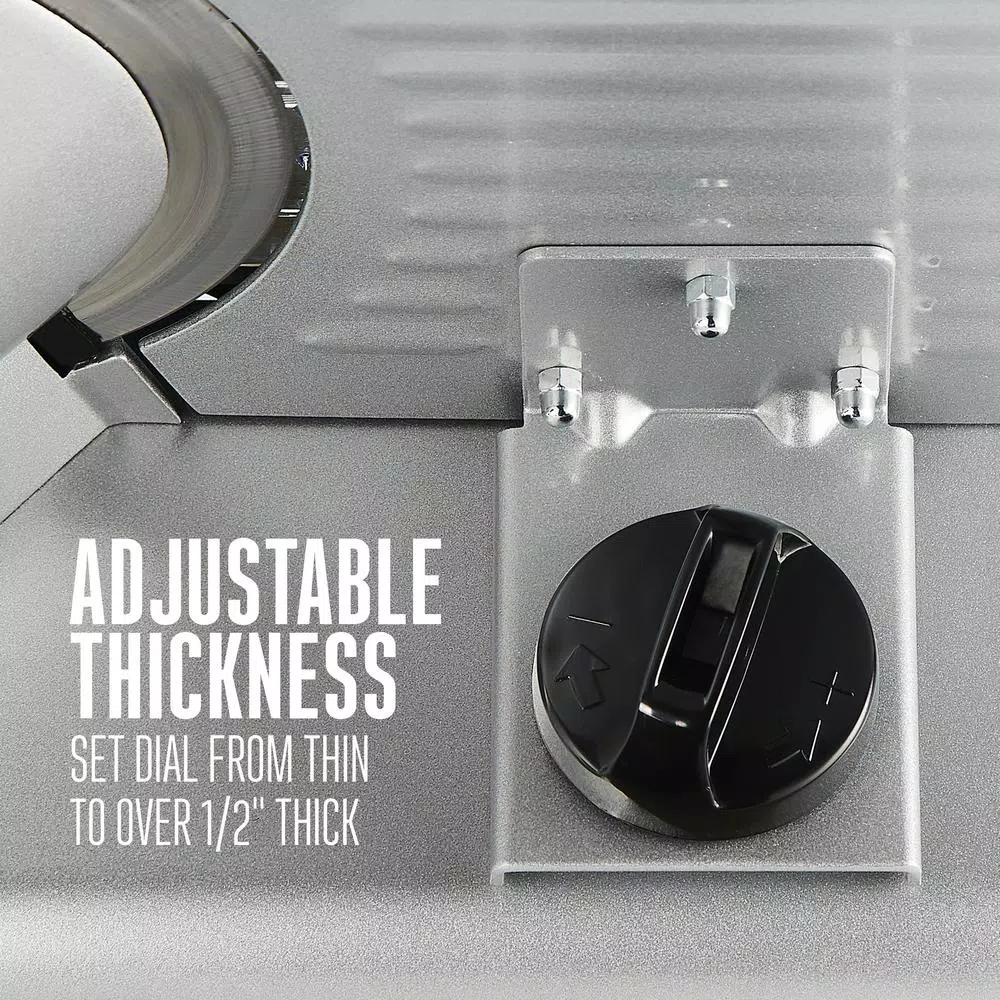 - Adjustable thickness settings from deli thin to 1/2 in. thick; includes food pusher with gripping teeth for controlled slicing