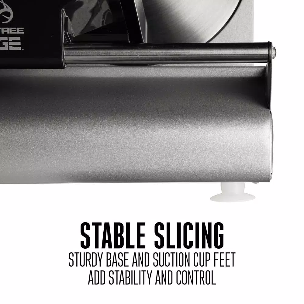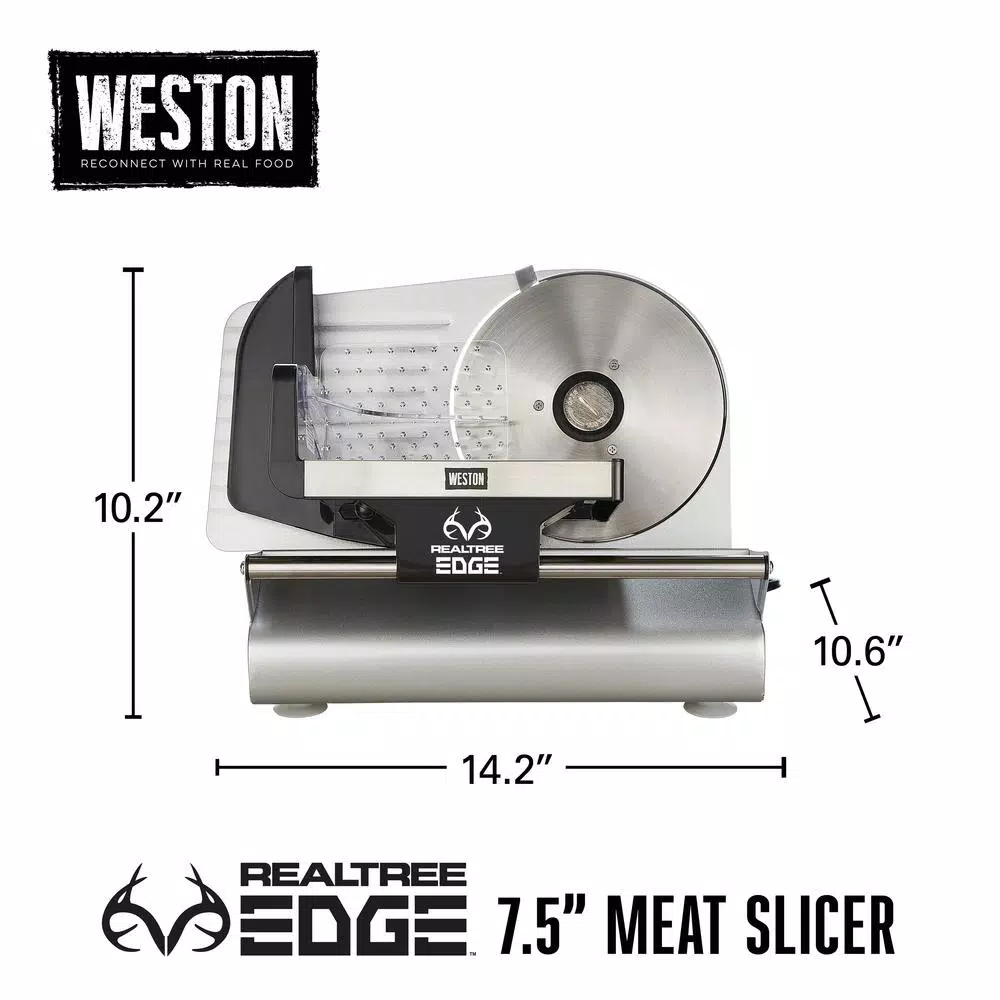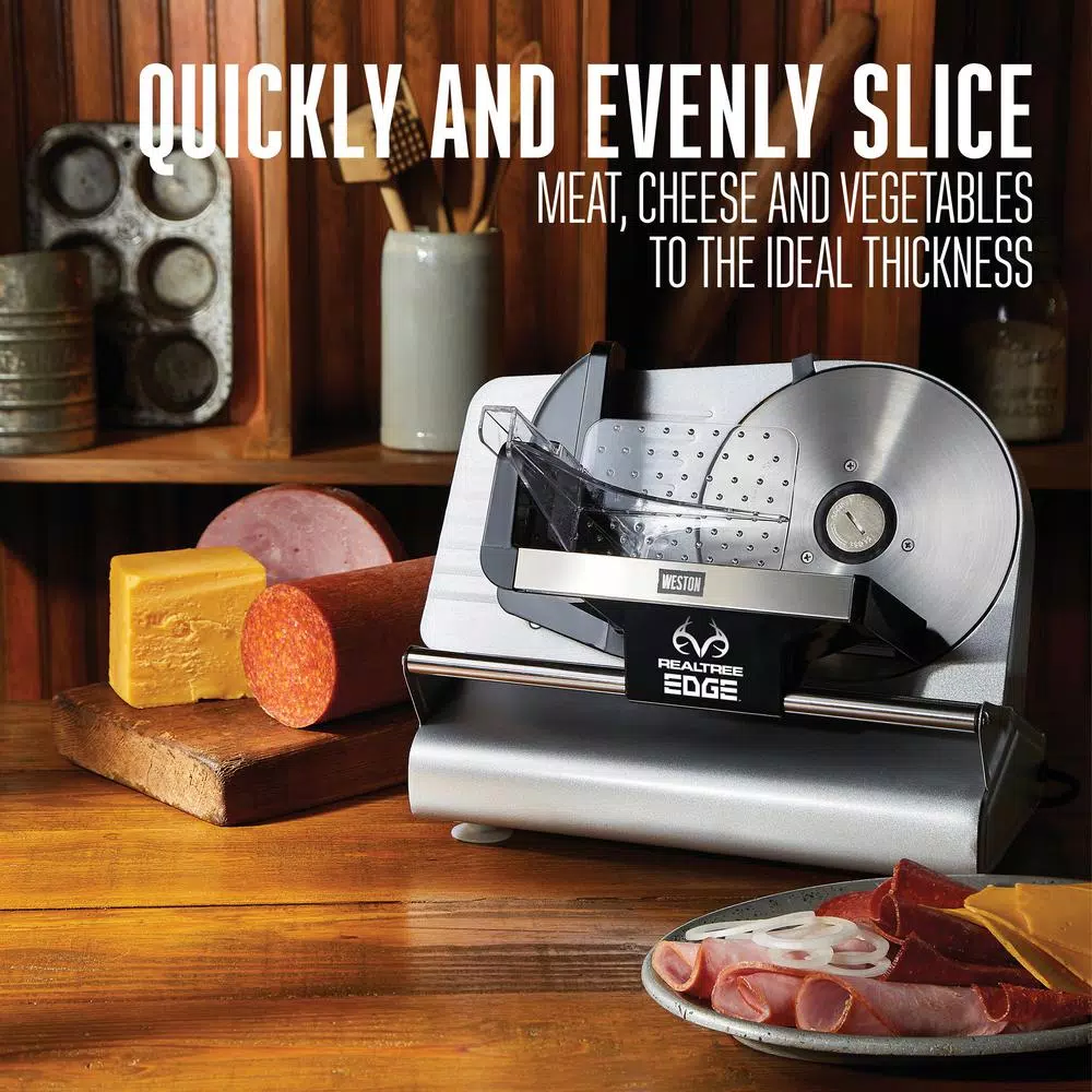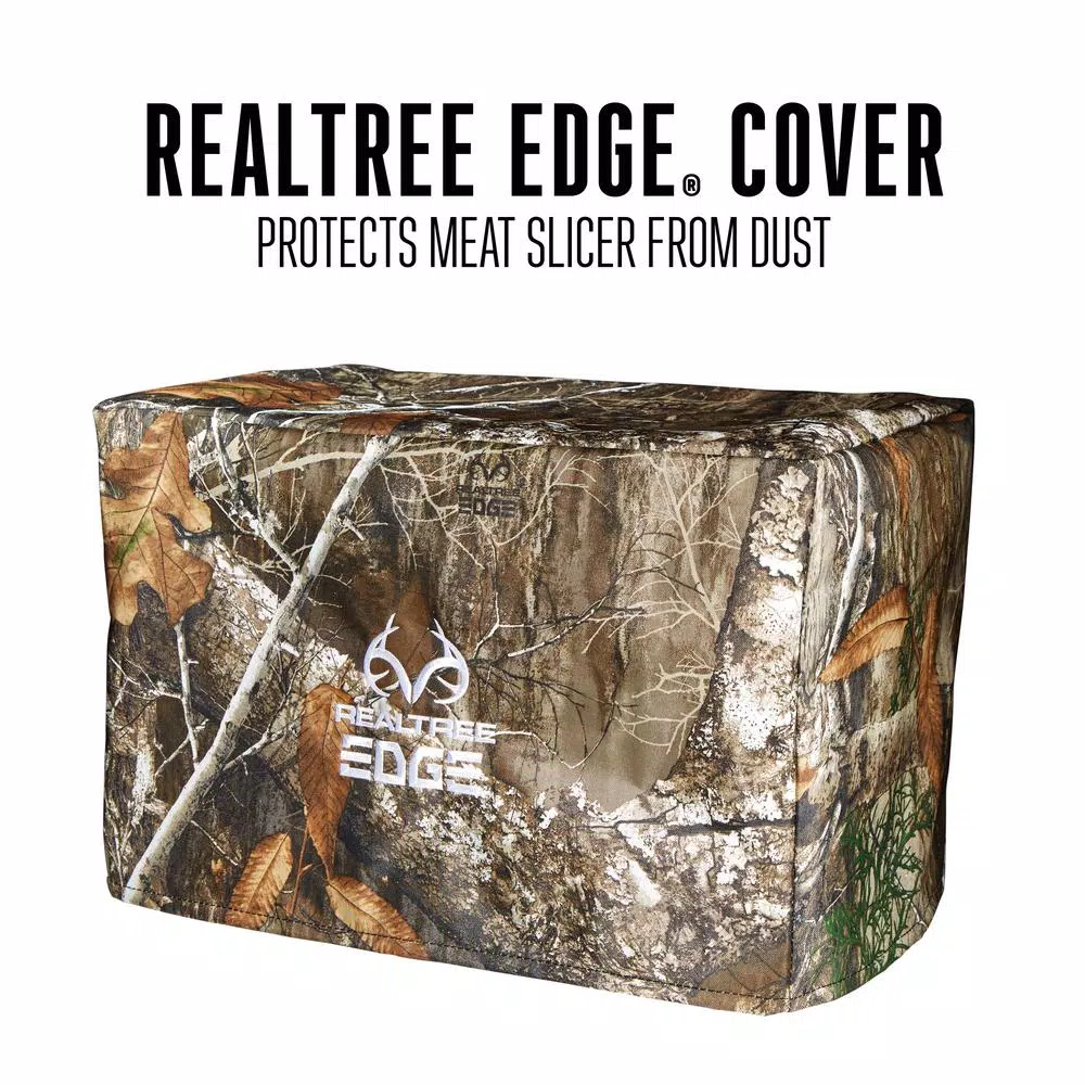Custom slice your harvest with the Realtree Edge 7-1/2 in. Meat Slicer by Weston with adjustable thicknesses from deli thin (for cold cuts) to 1/2 in. thick (for steaks and chops). The unit features a powerful 200-Watt motor with a removable 7-1/2 in. stainless steel blade rotary blade. The stainless steel food tray holds your bulk meat, and the food pusher with gripping teeth helps to ensure controlled slicing while moving along the smooth gliding carriage. Also includes a Realtree Edge camouflage cover for decorative countertop storage.